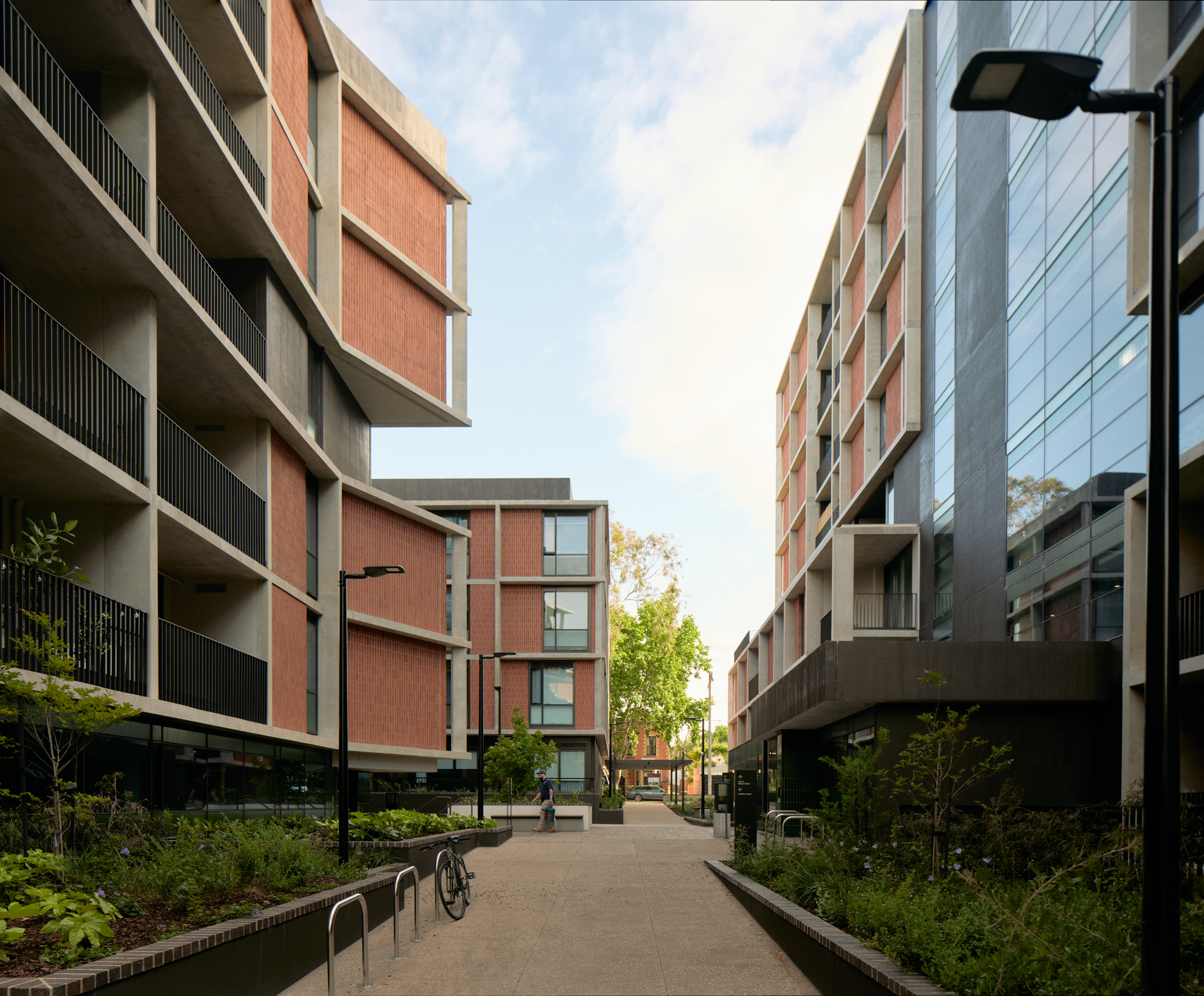 an opportunity for locals to connect with the creek along a new path created as part of the project. Open pathways from Walker Street provide vistas through the buildings and open onto sunny piazzas with eucalyptus trees, leading down towards bushland and water.